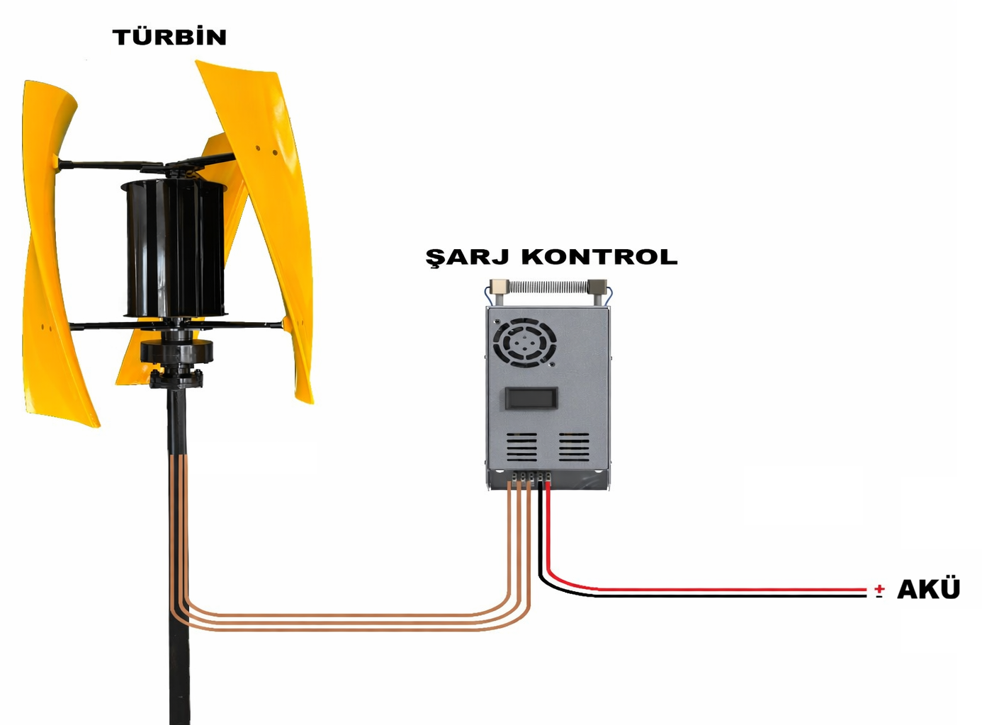 Bu kablolar, şarj kontrol cihazı üzerindeki türbin giriş terminallerine bağlanmalıdır.AC faz kablolarında bağlantı sırası önemli değildir. - Tüm elektrik bağlantıları tamamlandıktan sonra türbin direği kaldırılabilir.